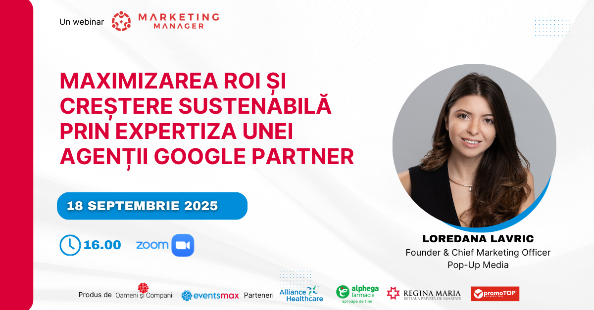 Pe 18 septembrie 2025, Loredana Lavric, fondator și CMO la agenția Pop-Up Media ne -a vorbit despre cum expertiza unei agenții Google Partner te poate ajuta să-ți maximizezi ROI și să ai o creștere sustenabilă, în webinarul Maximizarea ROI și creștere sustenabilă prin expertiza unei agenții Google Partner.